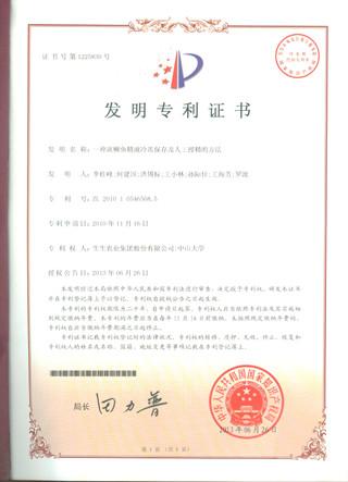 發明專利證書(一種斑鱖魚精子冷凍保存及人工受精的方法)