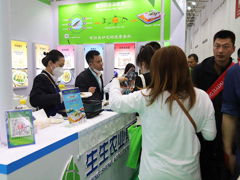 “無骨無刺又無泥腥味,肉質鮮嫩,汁水恰到好處,彈牙爽滑,口感層次豐富,真想不到鯇魚肉也可以這樣出乎意料?!币贿B三日,生生農業集團展位前人氣高漲,笙笙創鮮各式預制菜產品廣受好評,其中“健身魚扒”更是一如既往的搶眼吸睛,引發現場客戶紛紛表達合作意向。