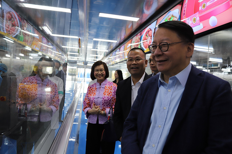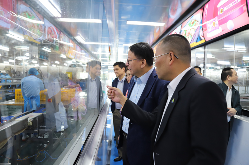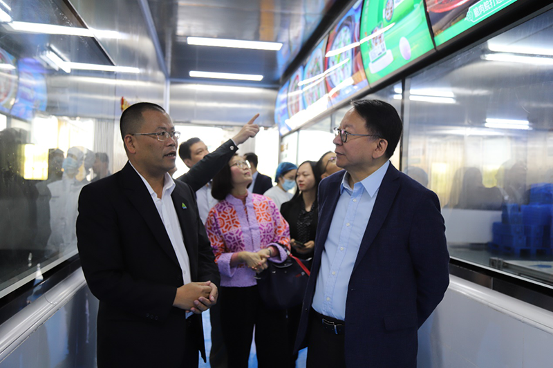 陳國基司長一行率先參觀生生農業集團預制菜智造中心,董事長洪錫標介紹道,生生農業集團打通一二三產,實施“從塘頭到餐桌”的水產全產業鏈運營管理,目前預制菜智造中心已實現自動化、規模化加工生產,并與專利團隊合作研發智能化生產設備、檢測設備、信息化系統、大數據平臺,實現生產信息透明共享、智能管理、嚴格品控及精準決策,做到安全、高效、可溯源,全線保證預制菜的品質與安全。司長一行表示中國內地的農業現代化發展水平令人贊嘆。