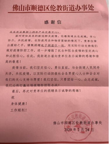 新冠無情,人間有愛。2020年,面對突如其來的肺炎疫情,在全球防疫用品和物資短缺的情況下,三洲農(nóng)產(chǎn)品交易中心分別在2月19日、2月24對倫教街道辦事處伸出緩手、雪中送炭。農(nóng)批中心何錦坤總經(jīng)理及市場運(yùn)營部梁俊熒副總經(jīng)理,赴辦事處親手捐贈一批電子測溫儀及1萬個(gè)愛心口罩,用實(shí)際行動支持社會對抗疫情,做好防控工作。街道辦領(lǐng)導(dǎo)代表對此表示誠摯的感謝和崇高的敬意。